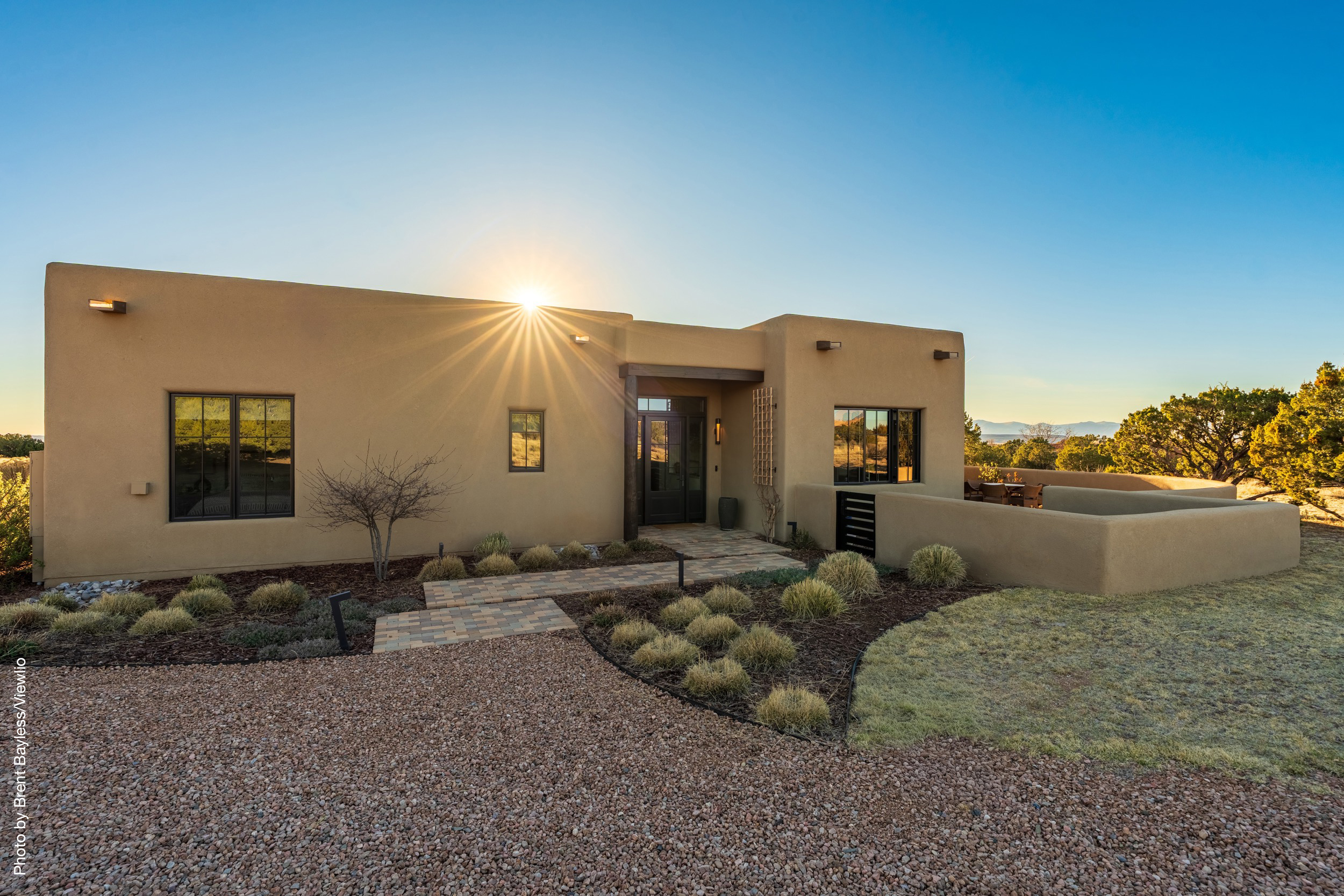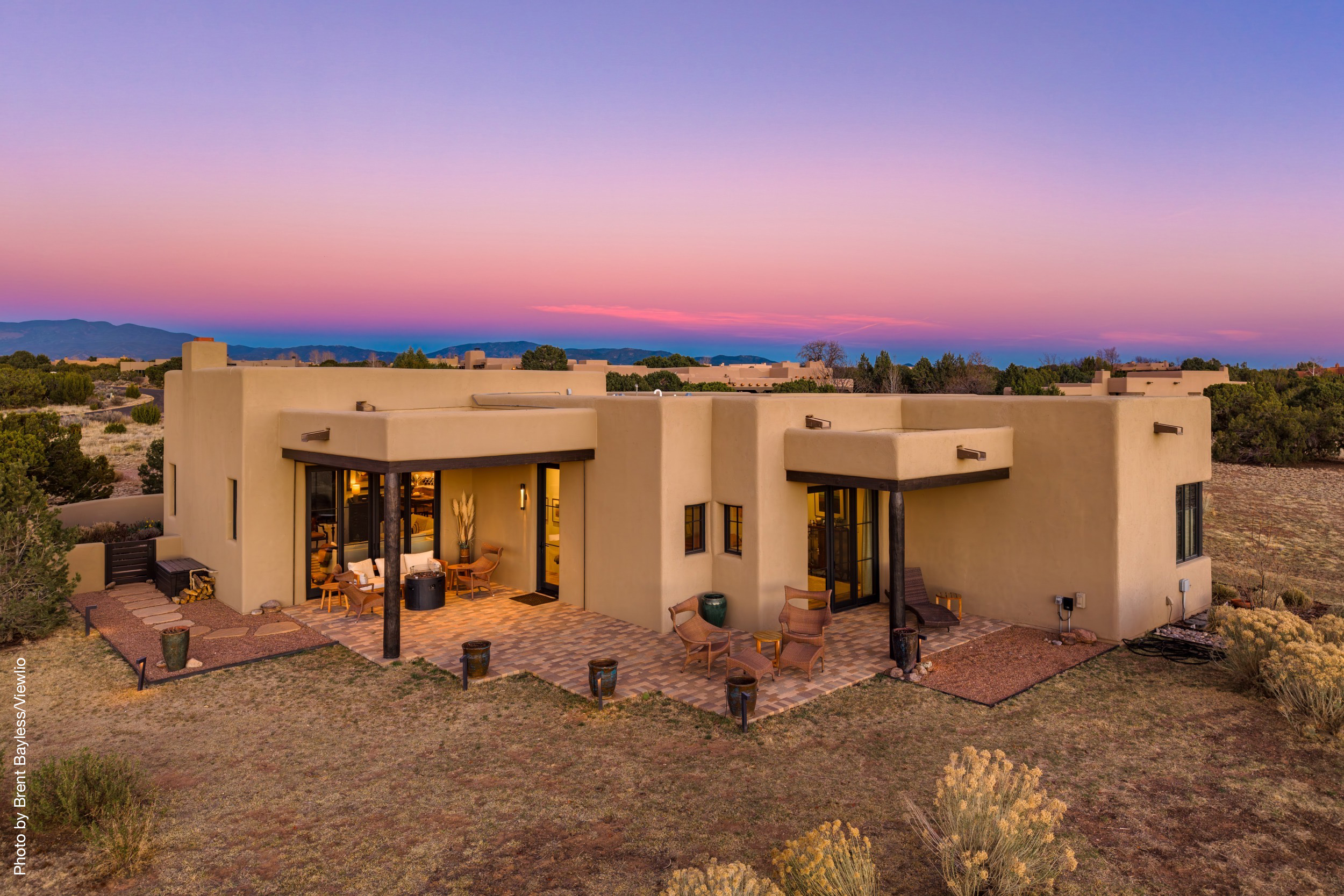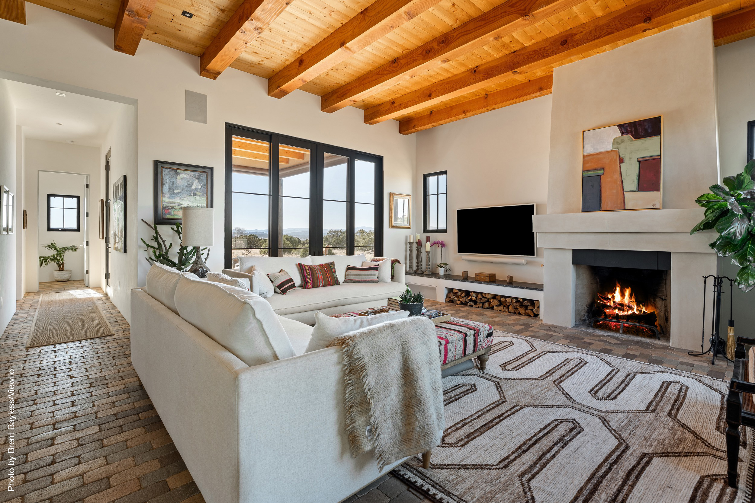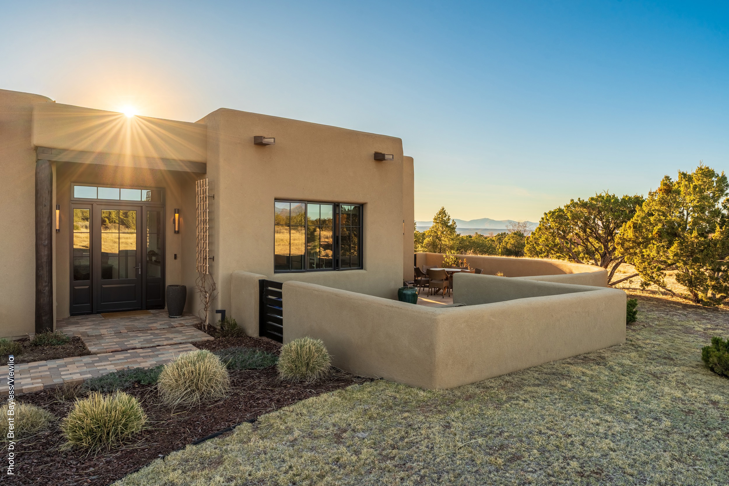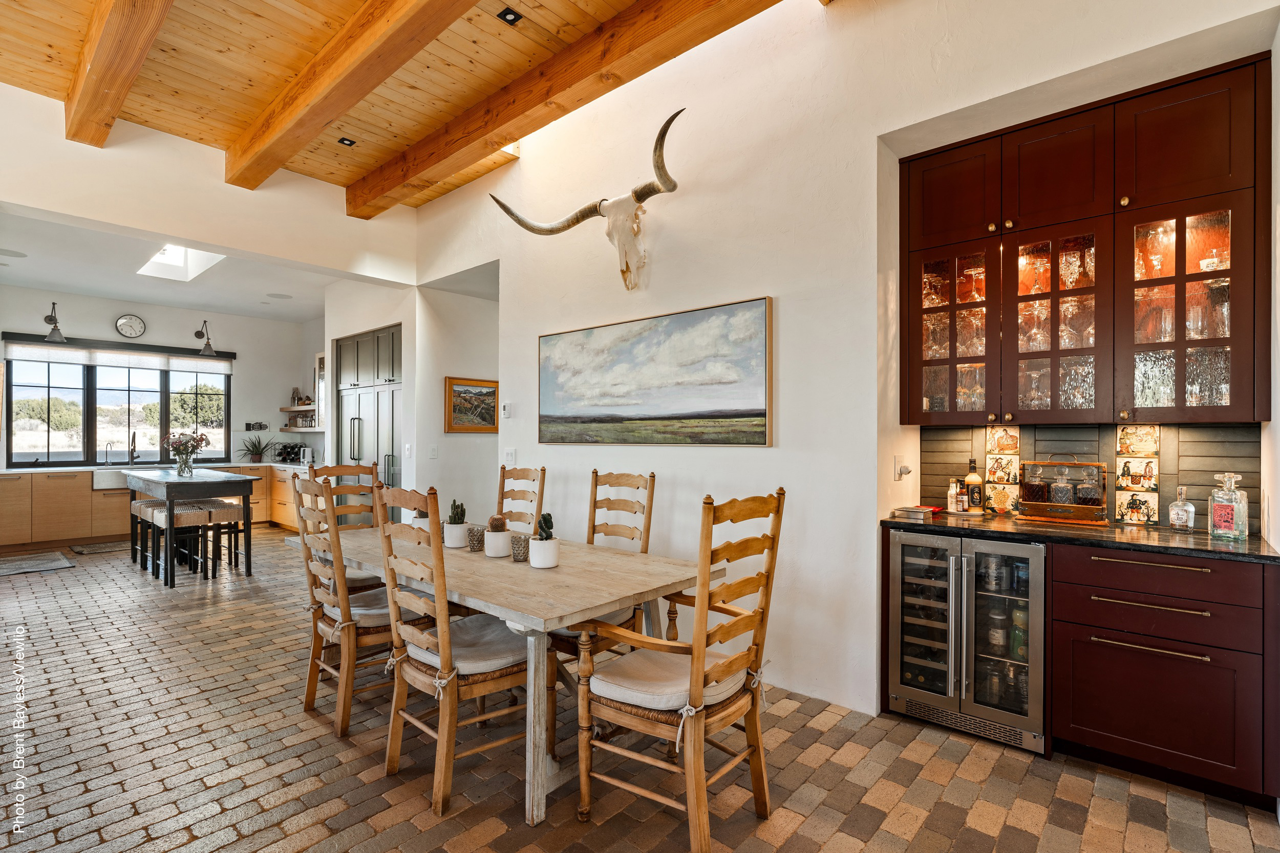 Well-sited to capture framed views of both the Sangre de Christo and Jemez Mountains this 3,400 square foot 3-bedroom 3-Bath home in Las Campanas is beautifully proportioned and centers around a great room bookended by a built-in bar and large masonry fireplace. Design features include custom doors, plaster, cabinetry, tumbled brick floors and exposed beams all of which add warmth and a sense of old-world craftsmanship to this contemporary Southwestern home.