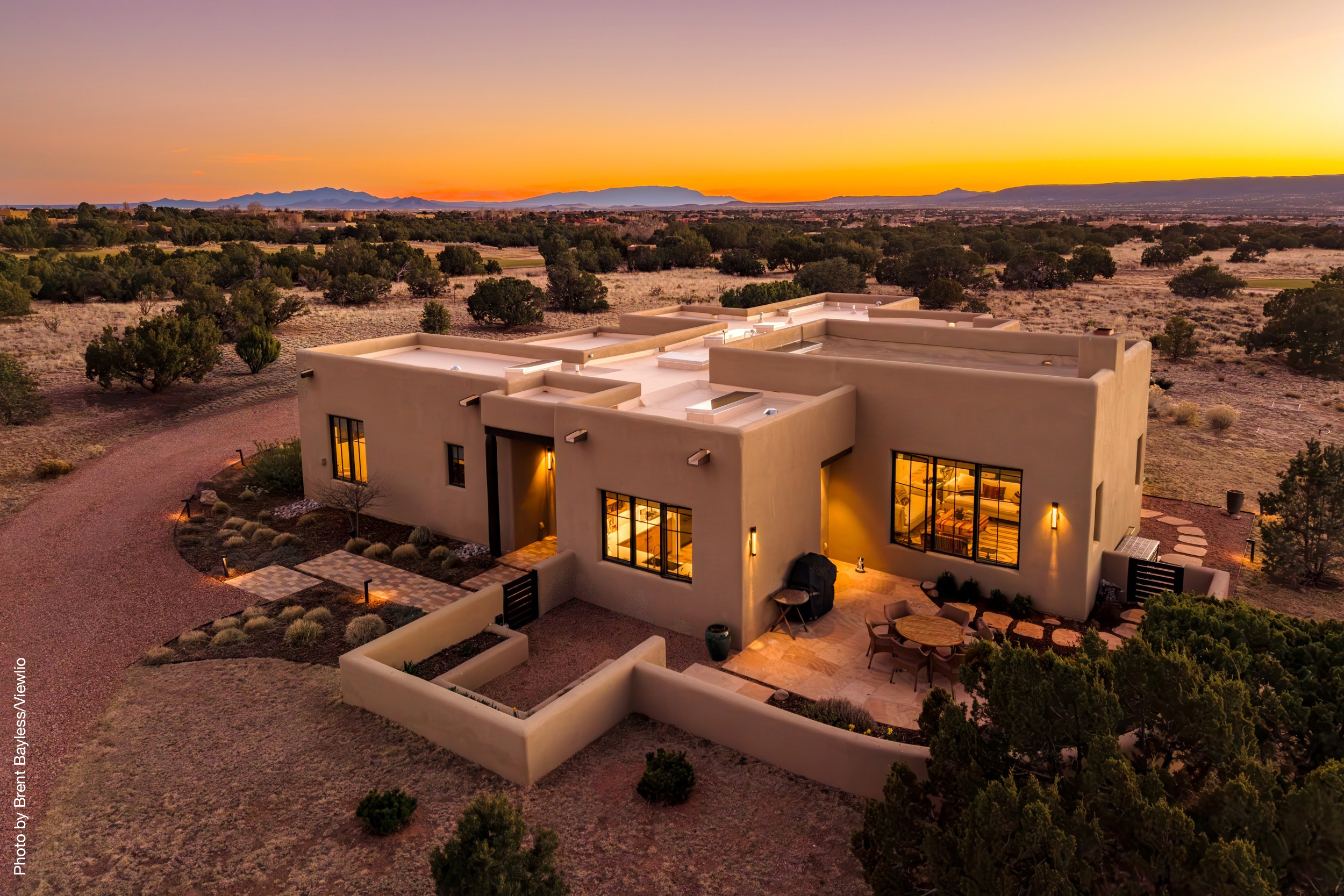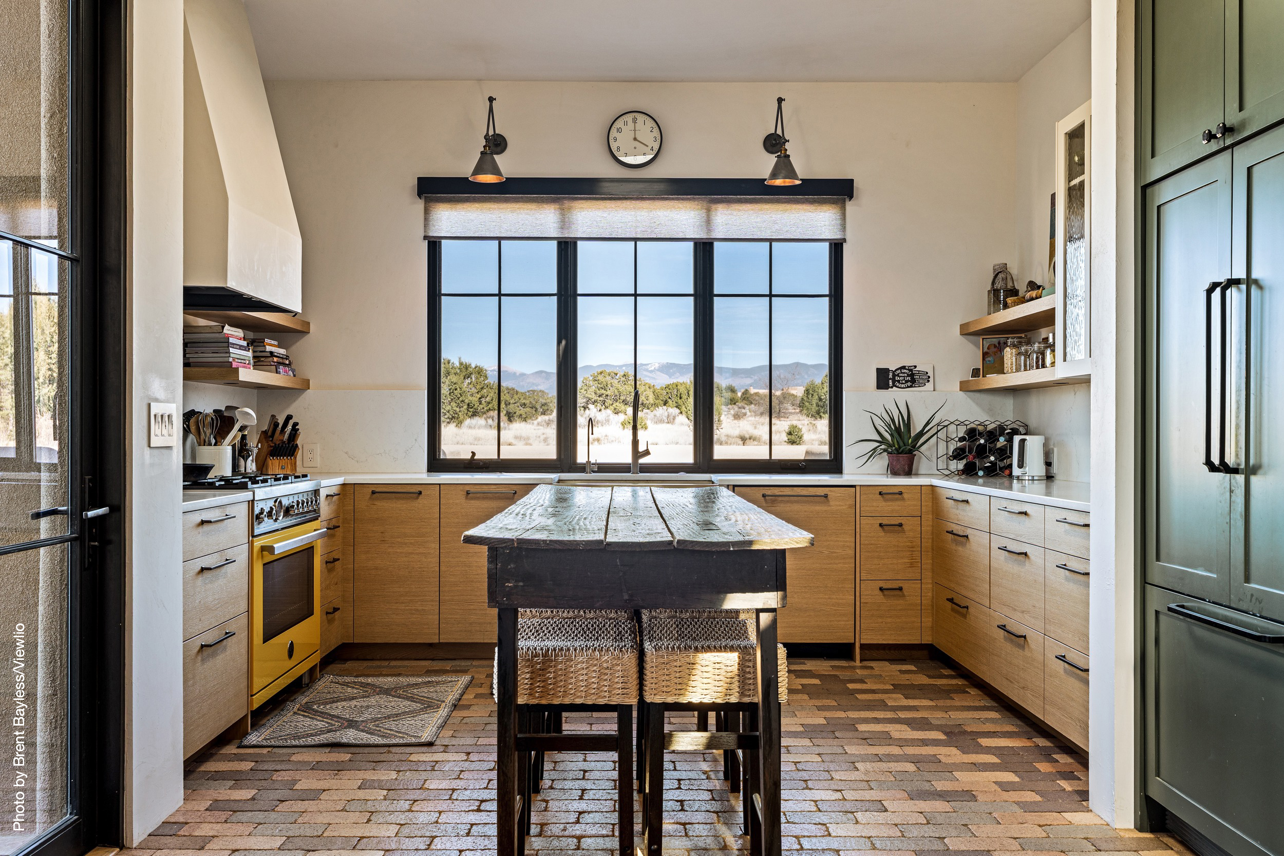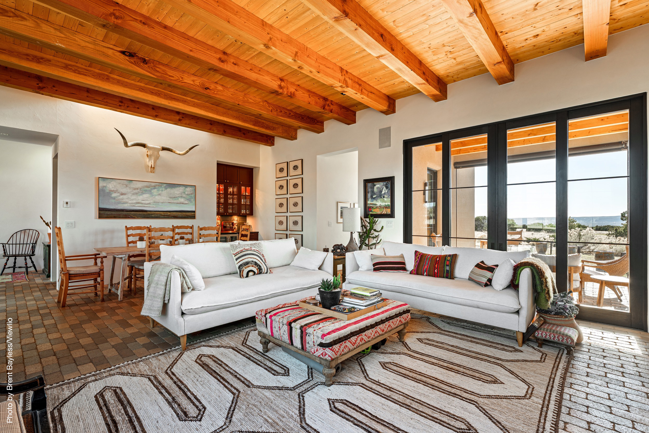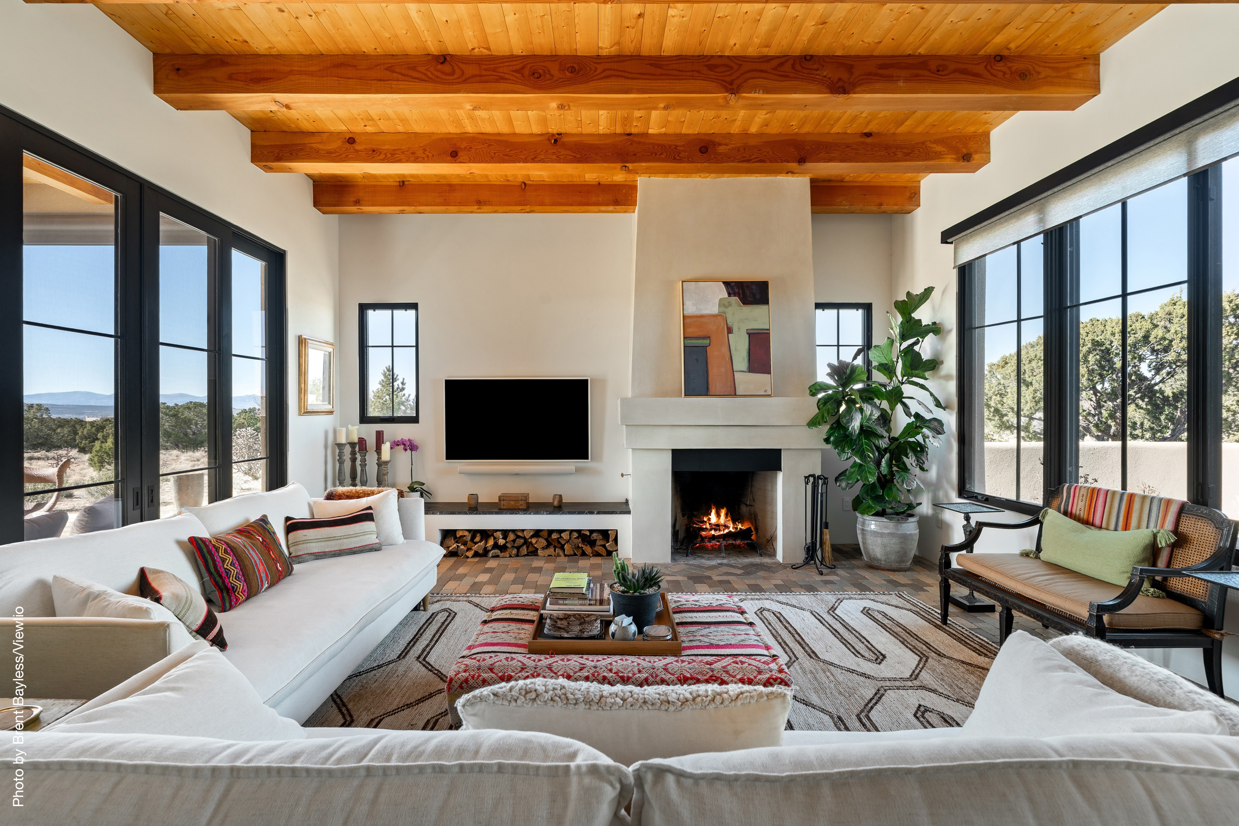 Well-sited to capture framed views of both the Sangre de Christo and Jemez Mountains this 3,400 square foot 3-bedroom 3-Bath home in Las Campanas is beautifully proportioned and centers around a great room bookended by a built-in bar and large masonry fireplace. Design features include custom doors, plaster, cabinetry, tumbled brick floors and exposed beams all of which add warmth and a sense of old-world craftsmanship to this contemporary Southwestern home.