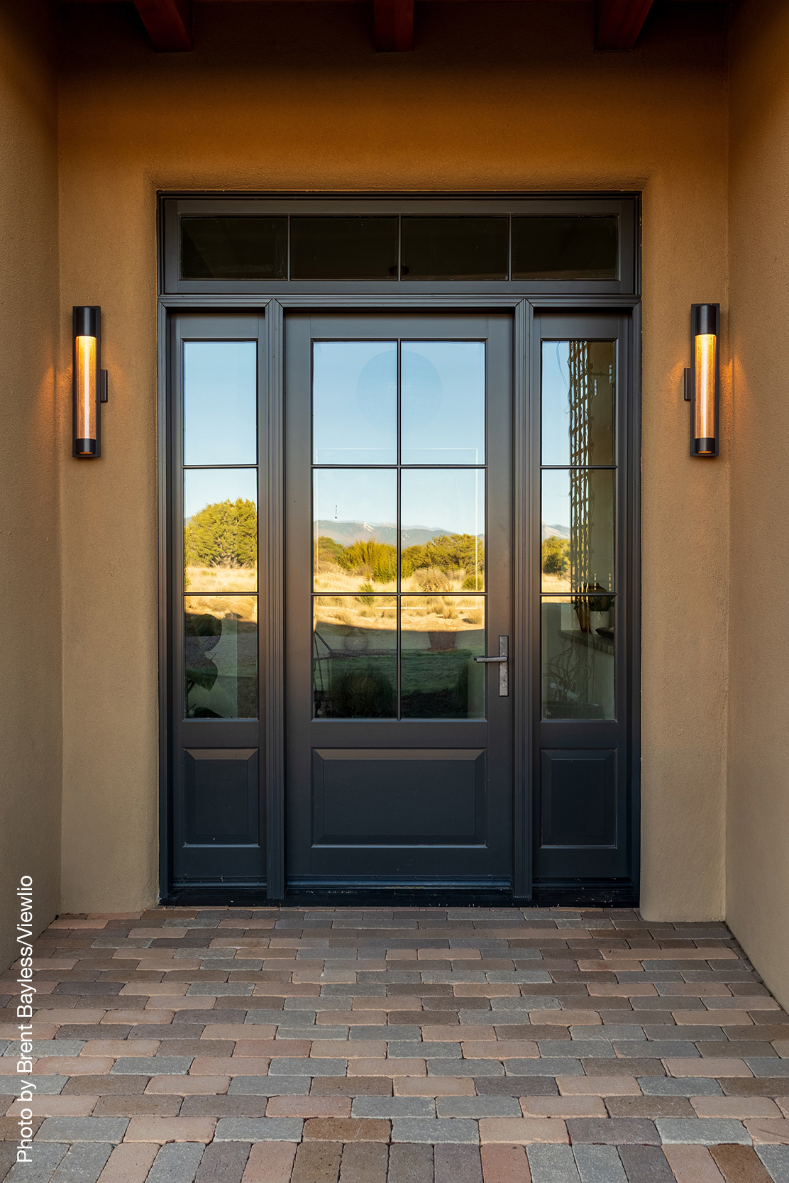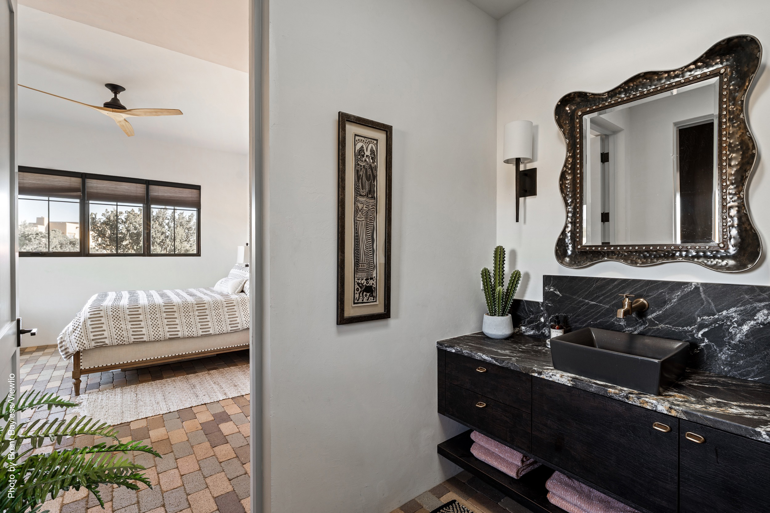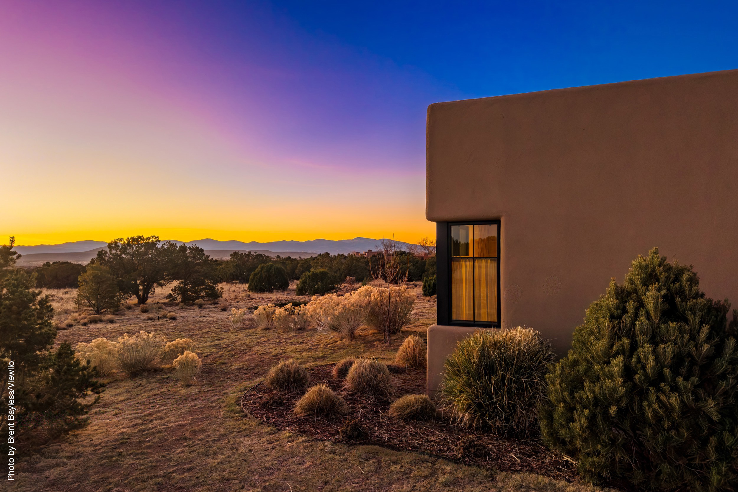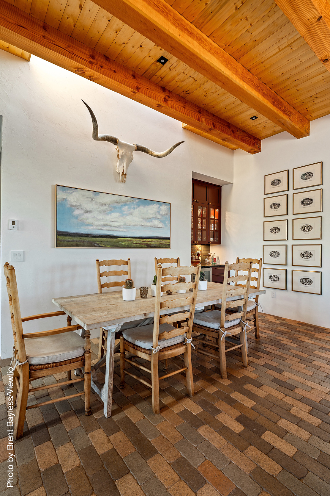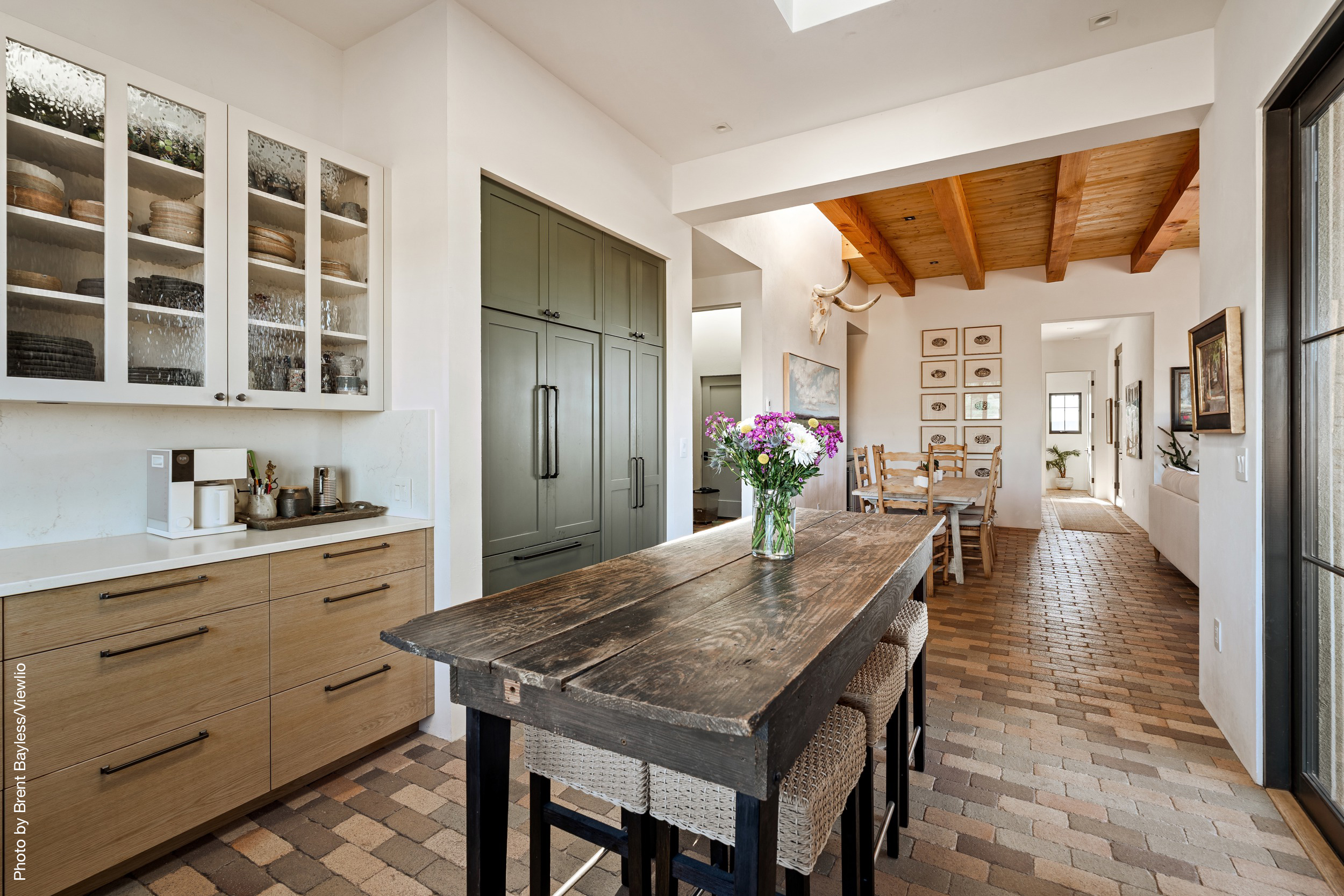 Well-sited to capture framed views of both the Sangre de Christo and Jemez Mountains this 3,400 square foot 3-bedroom 3-Bath home in Las Campanas is beautifully proportioned and centers around a great room bookended by a built-in bar and large masonry fireplace. Design features include custom doors, plaster, cabinetry, tumbled brick floors and exposed beams all of which add warmth and a sense of old-world craftsmanship to this contemporary Southwestern home.