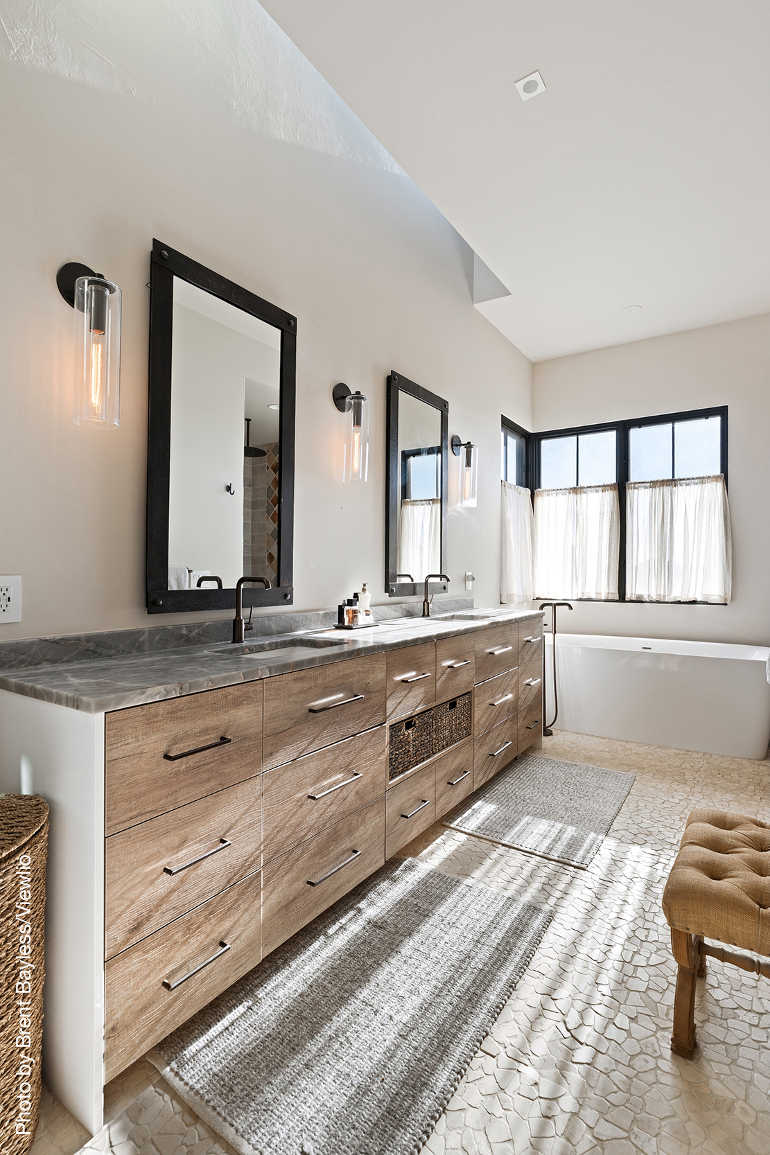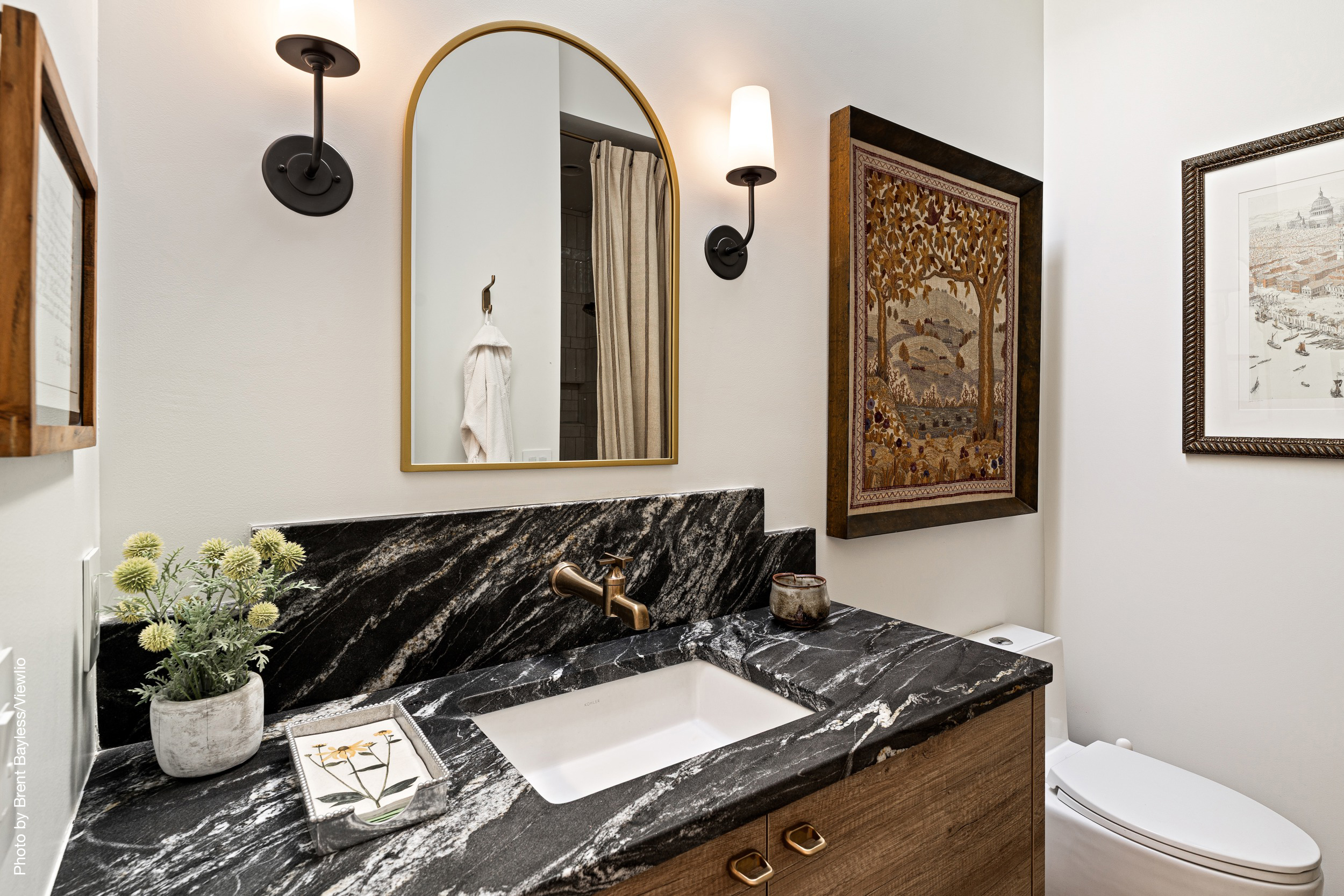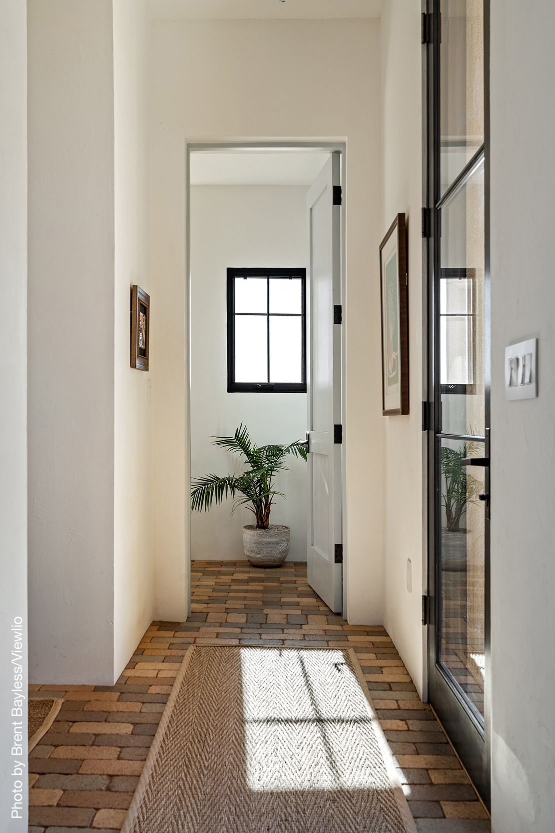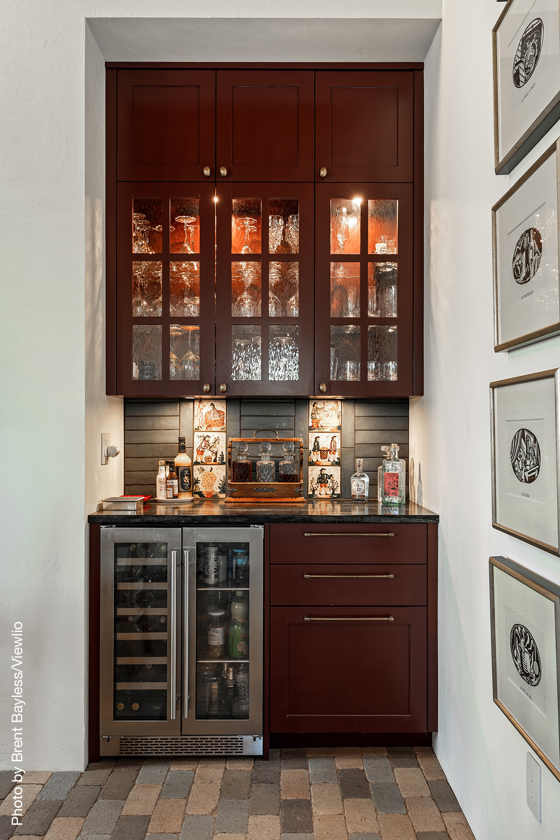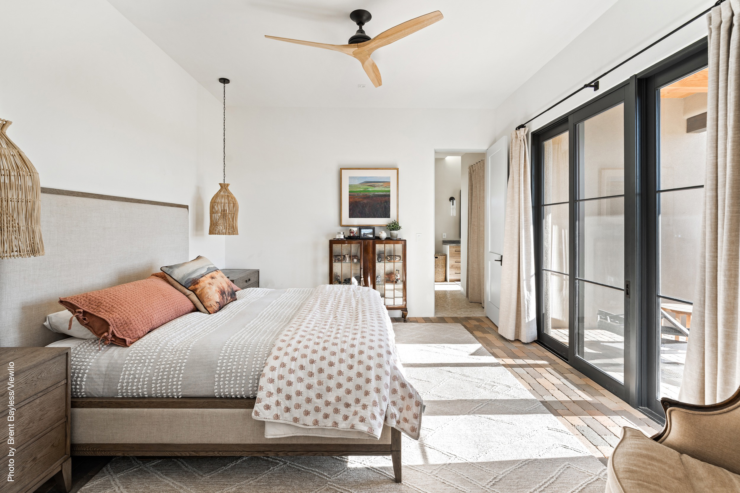 Well-sited to capture framed views of both the Sangre de Christo and Jemez Mountains this 3,400 square foot 3-bedroom 3-Bath home in Las Campanas is beautifully proportioned and centers around a great room bookended by a built-in bar and large masonry fireplace. Design features include custom doors, plaster, cabinetry, tumbled brick floors and exposed beams all of which add warmth and a sense of old-world craftsmanship to this contemporary Southwestern home.